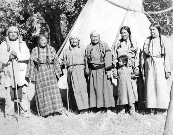 Sarah Pretty Paint, Hannah Roundface, unidentified, Agnes Holds the Enemy, June Roundface, Dorothy Stops-Hugs, child unidentified (courtesy Victoria Bad Bear)
